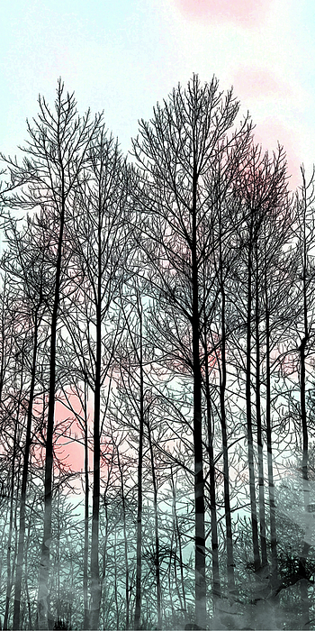 Pale pinks and blues peak through leafless branches on a cold winter evening as the sun sets and the mist rises.