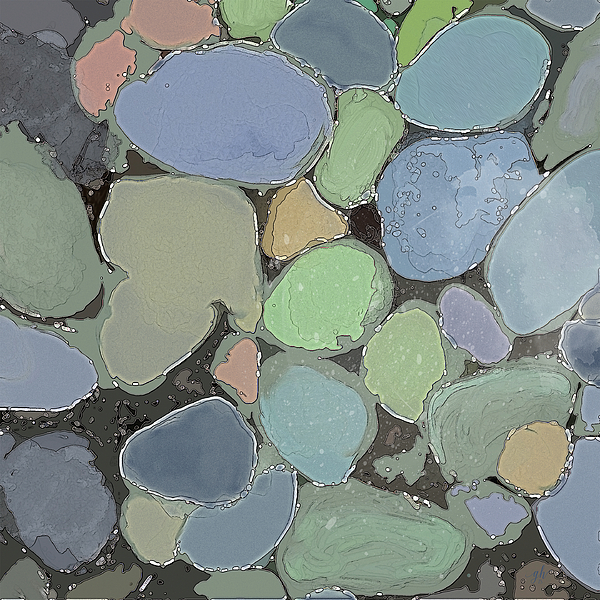 FAIRY POOL. 2018. Fanciful abstract of colorful river rocks in shallow pool, lightly washed with sand and bubbles. ... more