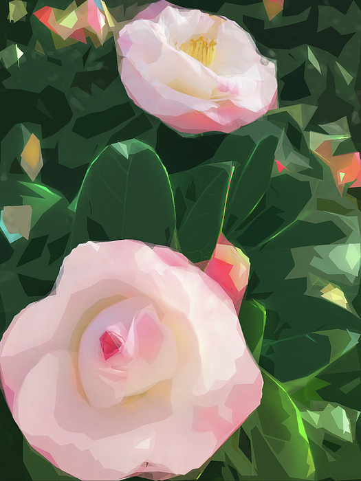 Stylized depiction of pink camellias in full bloom in late spring in Caswell Beach, NC.